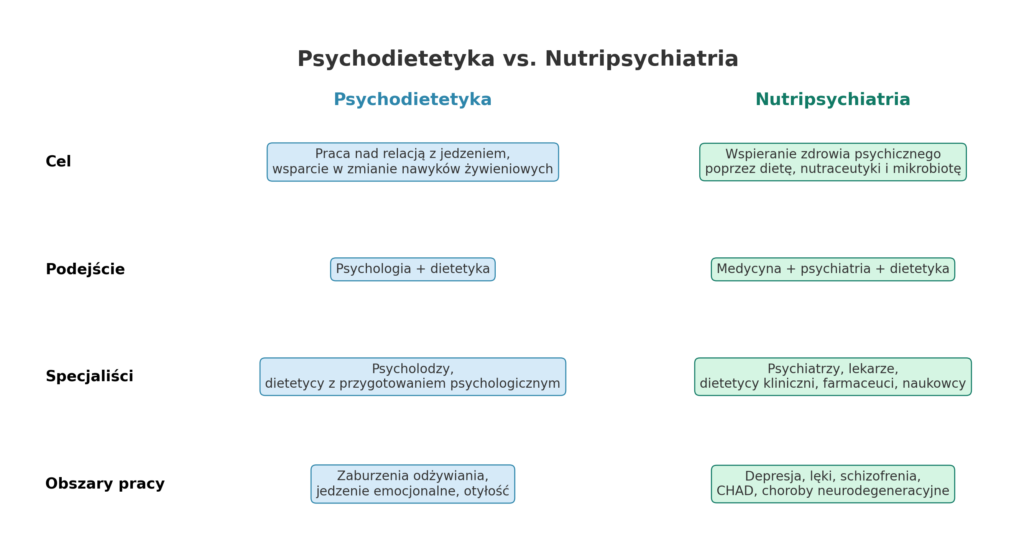 👉 Nutripsychiatrią zajmują się głównie psychiatrzy, lekarze, dietetycy kliniczni, farmaceuci i badacze. Jej celem jest nie tylko profilaktyka, ale też uzupełnienie leczenia psychiatrycznego.